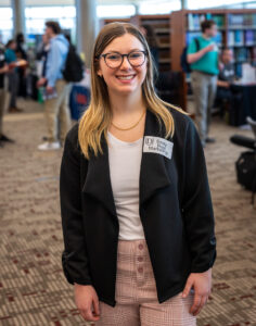 Marketing major Emily Root believes in the value of attending the Career Fair. She went looking for an internship she hopes will lead to a full-time position after she graduates next year.
