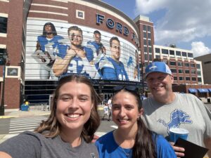 Courtney Drew attending a Detroit Lions game with her sister and father